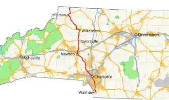 North Carolina Highway 16 (NC 16) is a 143.8-mile (231.4 km) primary state highway in the U.S. state of North Carolina. Traveling in a north–south direction, it connects the cities and towns of Charlotte, Newton, Conover, Taylorsville, Wilkesboro and Jefferson, linking the Charlotte metropolitan area with the mountainous High Country. NC 16 is part of a three-state route 16 that connects the Charlotte region with northwestern West Virginia.