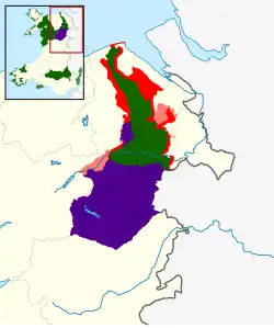 On 10 October 2023, NRW released an "area of search" map, a draft of the areas they are considering to include within the boundaries of a national park, replacing the existing AONB covering parts of Denbighshire, Flintshire and Wrexham. The draft area is proposed to possibly extend from the AONB southwards, across the Berwyn range (to Llandrillo) in Denbighshire, and the Ceiriog Valley in Wrexham, and into north Powys (specifically north Montgomeryshire). In Powys, the area considered is as far south as Llanfair Caereinion, covering the Tanat, Vyrnwy (therefore Lake Vyrnwy), Banwy valleys, and westwards to reach Mallwyd, in Gwynedd and Snowdonia (Eryri) national park. This would possibly create a "U-shaped" protected area across North Wales.[48][49] Smaller extensions around the existing AONB are also to be considered, such as Halkyn Mountain, between Holywell and Northop, Flintshire, around Hope Mountain and Caergwrle, and into the Vale of Clwyd.[48] The area under consideration would be three times larger than the existing AONB,[49] and would possibly span four principal areas (local authority areas), the existing Denbighshire, Flintshire and Wrexham, as part of the existing AONB but the possible addition of Powys as a fourth.[48][50] The draft map, however, is not the final boundaries of the park, but the maximum area to consider, with it expected to be further refined as the consultation process progresses. Some areas may not meet NRW's criteria on what should be within a national park, therefore possibly excluded in further refined proposals.[24][49][51][52]