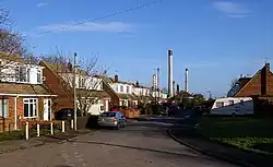 Both North and South Killingholme were enclosed in 1779 when the Booth family were lords of the manor.[20][21] In 1821 the parish of North Killingholme, including the hamlet of South Killingholme, had a population of 438.[22] By 1872 the parish contained 770 persons of which 196 were in North Killingholme.[23] In this period (1880s) the parish was almost entirely agricultural, excluding a small brick and tile works near North Killingholme Haven; almost all of the agricultural land was regular enclosed fields; there were two small woods, Burkinshaw's Covert and Chase Hill Wood, north-east of the village.[24] Excluding the developments on the Humber Bank at the Haven the general situation in the parish remained unchanged to the Second World War, with only minor growth of the village – a subsidiary development of a few houses to the south-west of the village centre, named Garden Village.[25]
