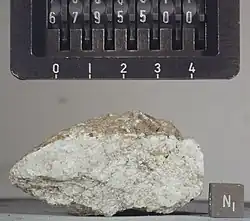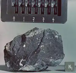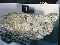 breccia | Exterior surface has a thin brown patina with micrometeorite pits; has been dated at 4.2 b.y. with exposure to cosmic rays for ~ 50 m.y. (age of North Ray Crater) |