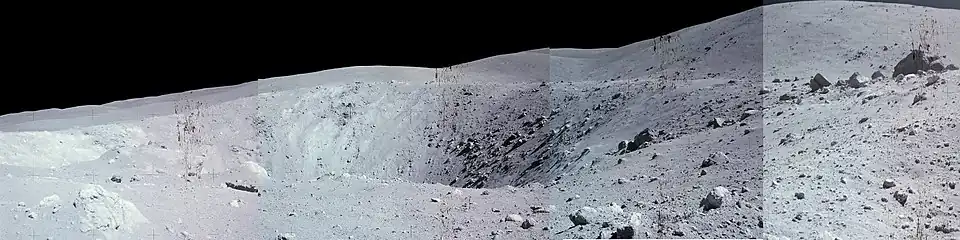 North Ray crater is approximately 1 km in diameter and approximately 240 m deep.[2] The astronauts observed that the upper 50 m of the slope is gentle, but that it becomes steep below 50 m, and they could not observe the bottom. The inner slopes are covered by boulders up to 5 m across. A huge (10 m high x 20 m long) boulder, known as House Rock, lies near the southeastern rim. A smaller boulder that is almost certainly a fragment of House Rock is officially known as South Boulder, but unofficially known as Outhouse Rock.[3] The ray system, which can be seen from orbit, was not obvious on the ground.