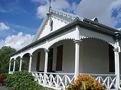 Situated in Stapleton Park and accessed via Bridge Street, the former North Rockhampton Borough Chambers is a single storey brick building, painted white, with a gabled roof clad with corrugated galvanised iron, with ogee shaped verandah surrounding the building on four sides. The verandah has timber balustrading and chamfered timber posts with moulded capitals. The roof has three ventilators on the northern and southern sides of the building. Timber finials and decorative timber fretwork to the gable are located at the western and eastern ends of the building.[1]
