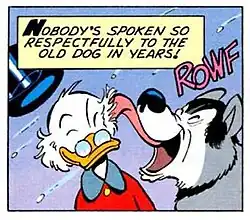 The old dog's name is Barko. The owner explains that Barko was once the North's greatest champion, but now he's old and stricken with rheumatism. It's then revealed that the other dog team is Soapy Slick's champion racing team (as the owner tells Donald this, Slick and his team pass by). Scrooge remembers how Barko helped deliver serum to Nome (a reference to the 1925 serum run to Nome). Befriending the old duck quadzillionaire, Barko nips the other dogs into their positions. Scrooge tells his nephews to stay in town while he deals with Soapy. Despite this, Huey, Dewey and Louie try to follow, but cannot keep up with the team's speed.