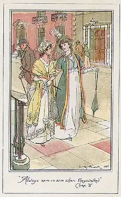 Isabella and Catherine walking arm and arm in an illustration by H. M. Brock from a 1904 edition of the novel