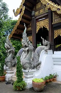 Nāgas and Makaras in front of a Wihan of the Wat Chet Yot in Chiang Mai (established in the 15th century under King Tilokaraj). Mythological creatures used as decoration for stairs are typical of the classical Lan Na architecture.