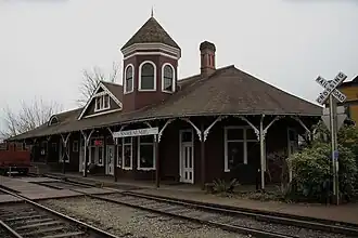 The station is a large frame building about 125 by 50 feet (38 by 15 m) with a generous 9 feet (2.7 m) eaves. A bay window features the telegrapher's office. The semicircular north end stands out in this design. The eaves are supported by wooden pillars and diagonal braces and scroll work decorates the intersection of the braces with the eaves and the pillars. The current structure was modified from the original, in which the bay window continued up through the roof and formed an octagonal tower a full story in height. A two sash window with a semicircular upper sash appeared on each face of the tower and a prominent cornice separated the tower body from the steeply pitched roof. The roof was decorated with fancy butt shingles and capped with a finial. A large swept dormer was placed in the southern part of the main structure above the freight section, Cast iron cresting and fancy butt shingles decorated the roof of both the main body and the transverse dormer. The freight dock, was wider originally and ran the length of the entire rear third of the station, is now a small porch in front of a single sliding freight door.[3]