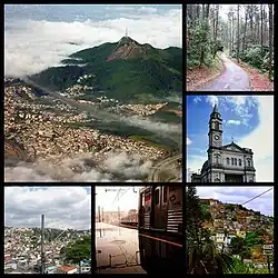 Location of Northwest Zone of São Paulo, Top left:Aeral view of The peak of Jaragua in Cantareira mountain range, Top upper right:A forest zona with a cycling and walking road in Anhanguera Park in Peras, Top lower right:O Santa Maria Church in Freguesia do O area, Bottom left:Vila Malvina residential area in Perus, Bottom middle:Jaragua railroad station, Bottom right:View of Jose Lopes residential area, nearby Cantareira mountain range