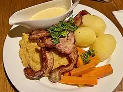 Svinestek – Roasted pork: a typical Sunday dinner, served with pickled cabbage (a sweeter variety of German sauerkraut), gravy, vegetables, and potatoes.