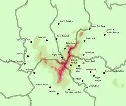 The bedrock of the ridge is London Clay formation, part of the Thames Group, made up of clay and silt layers of the Palaeogene period, formed between 56 and 47.8 million years ago (mya) in what was a marine shoreline.[1] This clay rises in the south at Selhurst in the borough of Croydon, through Grangewood Park, to its highest points in a band along the roads South Norwood Hill, Beulah Hill, Church Road, Crystal Palace Parade and Sydenham Hill before descending to variable lower elevations at Forest Hill and Honor Oak in the borough of Lewisham. Western spurs extend into the borough of Lambeth. The highest elevation of the ridge is 116 metres, around the southern end of Church Road and close to the site of the Croydon transmitter.[2][3]