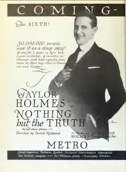 Nothing But the Truth is a 1920 American silent comedy film directed by David Kirkland and starring Taylor Holmes, Elsie Mackay and Ned Sparks.[1] It is based on the 1916 Broadway play Nothing But the Truth (1916) by James Montgomery which was in turn based on the 1914 novel Nothing But the Truth by Frederic S. Isham.[2]