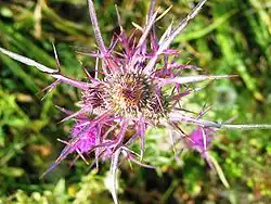 It is an annual plant belonging to the semi-desert flora, growing to 30–100 cm tall. The leaves are spirally arranged on the stems, deeply lobed, grey-green with white veins, and sharp spines on the margins and apex. The flowers are purple, produced in a dense flowerhead (capitulum) 2 cm diameter, surrounded by several spiny basal bracts.[3]