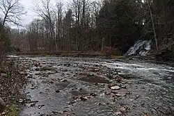 Nowadaga Creek flows over a bedrock bed for much of its length and, therefore, is not subject to alluvial processes as seen in many similarly sized river basins. Despite its natural and relatively undeveloped setting, for much of its length the creek lacks a well- developed natural floodplain. In many areas along the creek, the bedrock channel is disintegrating, and pieces of stone that originate from the channel bed are conveyed downstream and deposited in lower velocity reaches of the channel, contributing to debris jams, avulsions, and flooding.[4]