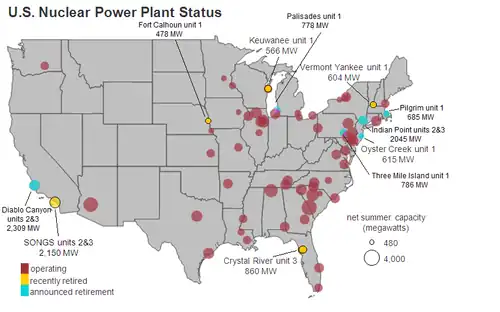 As of October 2014, the Nuclear Regulatory Commission (NRC) had granted license renewals providing 20-year extensions to a total of 74 reactors. In early 2014, the NRC prepared to receive the first applications of license renewal beyond 60 years of reactor life as early as 2017, a process which by law requires public involvement.[10] Licenses for 22 reactors are due to expire before the end of 2029 if no renewals are granted.[11] Pilgrim Nuclear Power Station in Massachusetts was to be decommissioned on June 1, 2019. Another five aging reactors were permanently closed in 2013 and 2014 before their licenses expired because of high maintenance and repair costs at a time when natural gas prices had fallen: San Onofre 2 and 3 in California, Crystal River 3 in Florida, Vermont Yankee in Vermont, and Kewaunee in Wisconsin.[12][13] In April 2021, New York State permanently closed Indian Point in Buchanan, 30 miles from New York City.[13][14]