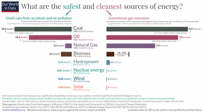 As of February 2020, Our World In Data stated that "nuclear energy and renewables are far, far safer than fossil fuels as regards human health, safety and carbon footprint," with nuclear energy resulting in 99.8% fewer deaths than brown coal; 99.7% fewer than coal; 99.6% fewer than oil; and 97.5% fewer than gas.[28]