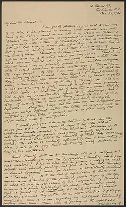 "Nyarlathotep" was based on one of Lovecraft's dreams.[4] The first body paragraph of the poem was written "while he was still half-asleep".[5] The poem, which stands as the first appearance of the titular Cthulhu Mythos entity Nyarlathotep,[6] was described by Lovecraft as "a nightmare".[7] In the inspiring dream, Lovecraft read a letter from his friend Samuel Loveman that contained an invitation, which is as follows: