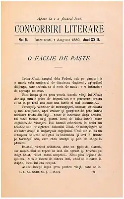 O făclie de Paște or O făclie de Paști (Romanian for "An Easter Torch") is a naturalistic novella written by Romanian writer Ion Luca Caragiale. It was first published in Convorbiri Literare (no. XXIII/1889–1890) and as a self-standing brochure in 1892. Subsequently, it was included in many anthologies and editions of Caragiale's prose.[1] The novella was freely adapted to the screen by Radu Gabrea in his 1981 film, Fear Not, Jacob!.[2]