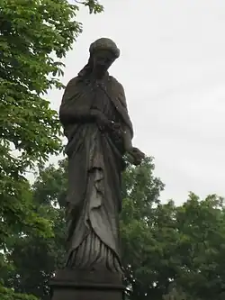Photo showing part of a grave marker that is the sculpture of a woman and an oversight of the rest of the cemetery