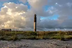 Beach erosion has been a continuing problem for the island, with the first major success in restoration, the 2001 sand deposition on the east end of the island using material dredged from the Wilmington Harbor Channel.[14] Since then, two similar projects have been completed along with other, smaller efforts, e.g two Sea Turtle Habitat Restoration Projects.[15] Concern about the beach has also occasioned the creation of Beach Preservation Trust funds by both the Towns of Oak island and Caswell Beach and the formation of active citizen groups supporting the Natural Resources Defense Council "Protect our Coast" effort.[16] One such group, familiarly known as the Crabbies was a key player in the Brunswick County effort opposing seismic testing and off shore drilling as proposed the Bureau of Ocean Energy Management (BOEM).[17] In 1958, the Oak Island Lighthouse became operational. Located on the east end of the island, in 2004 the Town of Caswell Beach acquired it and in 2007 it was added to the National Register of Historic Places.[18] In 1962 the first 9 holes of the Oak Island Golf Club designed by George Cobb opened for play. The second nine holes was completed in 1975, the same year the Town of Caswell Beach was incorporated. As a result of both the course and island's sequential development, 13 holes of the golf course are in Caswell Beach while five holes are in the Town of Oak Island.