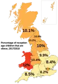 In 2019 Wales had the highest child obesity percentage out of the four constituent countries of the United Kingdom and had a higher obesity rate than England.[67][66][68] One in eight reception age children in 2019 were reported to be obese[69] and 3.3% of children were severely obese.[70]