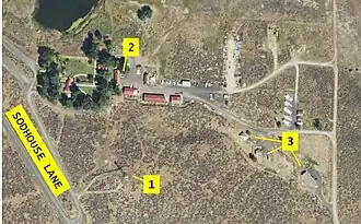 A USGS satellite image of the Malheur National Wildlife Refuge headquarters shows a fire lookout used as a watch tower (1), the main offices used as a headquarters (2), and buildings used as a canteen and barracks (3).