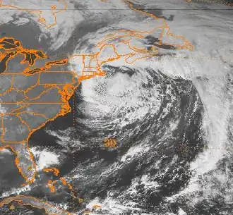 Before affecting Canada with high winds and waves, the storm system produced heavy early-season snowfall totals in New England and southeastern Canada.[1] In Baxter State Park in northern Maine, snowfall totals reached 24 in (610 mm). The combination of snow and wind gusts of 40 mph (64 km/h) broke tree limbs and caused power outages.[3] Further south, winds of 55 mph (89 km/h) struck eastern Massachusetts, which downed several power poles; about 1,200 people lost power.[5]