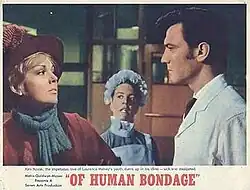 Of Human Bondage is a 1964 British drama film directed by Ken Hughes and starring Kim Novak and Laurence Harvey in the roles played by Bette Davis and Leslie Howard three decades earlier in the original film version. This MGM release, the third screen adaptation of W. Somerset Maugham's 1915 novel, was written by Bryan Forbes from the novel by Somerset Maugham.