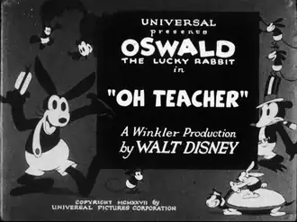 Oh Teacher is an animated cartoon directed by Walt Disney, starring Oswald the Lucky Rabbit, and distributed by Universal Pictures.[1] The film was reissued in 1932 by Walter Lantz Productions with added music and sound effects and is the only known version to survive. The original version entered the public domain on January 1, 2023.