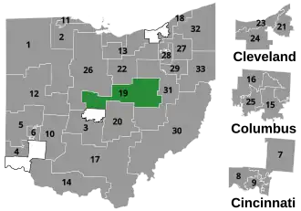Ohio's 19th senatorial district is based in north-central Ohio, and currently consists of Delaware and Knox counties as well as a portion of Franklin county. It encompasses Ohio House districts 22, 67 and 68. It has a Cook PVI of R+14. The district was represented by the Senate President from 2005 to 2010 with Senator Bill Harris. Its current Ohio Senator is Republican Andrew Brenner. He resides in Powell, a city located in Delaware County.