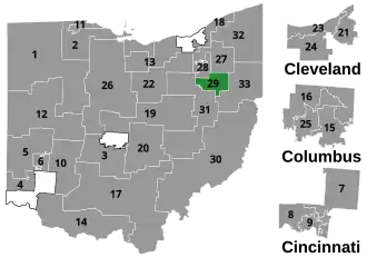 Ohio's 29th senatorial district has historically been based in Canton, Ohio. It now consists of the majority of Stark County. It encompasses Ohio House districts 48, 49 and 50. It has a Cook PVI of R+10. The current Ohio Senator is Republican Jane Timken, who was appointed to the seat in January 2025.