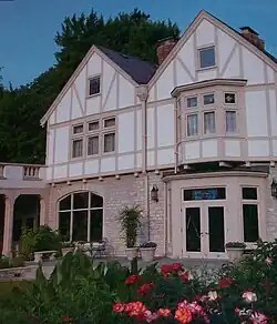 The residence is of the Jacobean Revival style, with a few modern elements blending into the original scheme. The walls consist of a combination of stucco and limestone with Bedford stone quoins on the corners, capping of the gables, and framing the windows and doorframes. The stone exterior are broken up by portions of half-timbered panels on the second floor. The gable roof is of sturdy pitched slate with several large brick chimneys protruding from the house. The second floor also contains several bay windows.