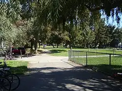 It is mostly grass with a scattering of trees and includes pedestrian and bicycle paths, a dog park, a basketball court, and a small ball field. The dog park, established in 1979 when the park was dedicated, was one of the first off-leash dog parks in the United States.[1][2] There are four play areas for children, two for school-age children at McGee and at Milvia, and two for toddlers at Bonita and at McGee.[1]