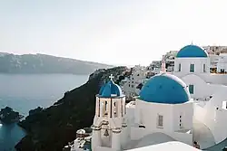 Oia typifies the white-painted houses of the Cyclades, in many cases built directly into niches which are cave houses used by crew of the ships, on the lip of the volcanic crater, between which are narrow alleys and blue-roofed churches with cupolas. The wealthy ship captains of the late 19th century built neo-classical mansions. These houses are seen built in succession one above the other.[14]