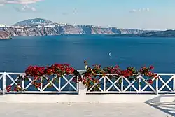 The village is located on top of a hill, at about 150 m (500 ft) elevation, and known as the "Eagles nest" from where Palia and Nea Kameni volcanoes are seen and also the island of Therasia. It is situated to the north of the island and Fira is at distance of 11 km (7 mi).[13] The main street in the town, in the central square, is the main trekking path which is cobbled, called the "Nikalaou Namikaou", which goes up the hill winding round the caldera. The island is reached from Fira which is the transport terminus of the island.[6][14] Caldera boat cruise options are available from either Oia or Fira.[15]