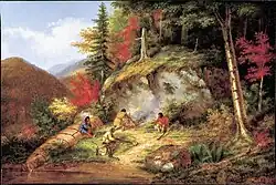 The traditional Ojibwe cosmogony is a version of the Earth diver narrative.[131] Among the Ojibwe, this cosmogonical story exists in various different forms although with some common features.[132] These stories typically maintain that there were once the Aadizookaanag ('original people') who went naked and did nothing; Kitche Manitou then sent them a messenger to teach them various things. In some versions this messenger is Nanabush, although in others he came later.[133] Nanabush then went hunting with the wolves, one of whom was his grandson Chibiabos. After water serpent manitouk killed Chibiabos, Nanabush slayed the head serpent. They pursued him, seeking vengeance, and so he climbed atop a tall tree on a mountain. They flooded the Earth to reach him; Nanabush then sent a muskrat to dive to the bottom, collecting soil, from which Nanabush formed a new Earth.[134] Some modern Ojibwe regard this cosmogony as a literal account of their history; they reject archaeological and genetic evidence indicating that Native Americans descend from prehistoric Asian migrants.[135]