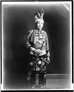 Any Ojibwe, if inspired by a manitouk, might institute a new dance, feast, or ritual.[193] There are also cases of dances being adopted from other Native peoples. In 1878, for instance, certain Ojibwe adopted the Dream Dance from Dakota people. The central feature of this tradition was a circular dance based on the Grass Dance of the prairies and plains peoples.[194] The Dream Dance remained active among Ojibwes into at least the late 20th century.[195] Some Ojibwe living near the Plains region also engaged in the sun dance, a practice likely adopted from the Cree.[196]