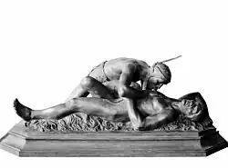 Historically, elderly individuals were sometimes killed by their family or left on an island to die.[212] Following a death, a mourning ceremony would be held in which the manitouk would be invoked to aid the living.[166] Prior to European contact, a common means of disposing of the Ojibwe dead was to wrap them in bundles and place them in the branches of trees.[213] After European contact, the Ojibwe adopted the practice of burying their dead, with archaeological excavation suggesting that they typically did so after the bones had been defleshed.[213] There are accounts of the Ojibwe, like the Menominee, erecting gravestones over the graves of their leaders, on which pictographs illustrate important scenes from the deceased's life.[214] Respect is accorded to bones as the most durable part of the body.[208]