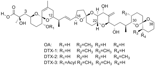 Okadaic acid (OA) and its derivatives, the dinophysistoxins (DTX), are members of a group of molecules called polyketides. The complex structure of these molecules include multiple spiroketals, along with fused ether rings.[1][5]