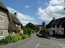 The present parish of Okeford Fitzpaine includes several areas that used to be within other parishes: Banbury Common (formerly in Child Okeford parish), the centre of the old parish of Belchalwell (plus four of its five separated parts), and part of Fiddleford (east of the Darknoll Brook).[4] Until 1966 almost the entire village was owned by the Pitt-Rivers family, so it has no "big house", and comprised mostly tenant farmers. The village was sold off at auction by his mistress Stella Lonsdale following the death in 1966 of George Pitt-Rivers, who specified that the Estate not be sold as such, but that each property be sold individually, so that existing tenants might buy their leased farms.[8][9]