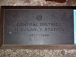 A plaque to mark the site as the location of the Central District Ambulance Station from 1927 to 1990.