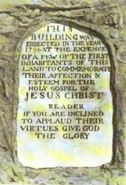 In 1792, Rev. Benjamin P. Grigsby succeeded Mr. McCue as pastor. The Old Stone church was built in 1796 under Grigsby's pastorate. Then occurred the first mention of a woman's Christian service, within the bounds of the Synod of West Virginia. Mrs. Agnes Stuart (nee Agnes Lewis, of the line of Col. Andrew Lewis), wife of Col. John Stuart, was the principal subscriber to this building, she and her brother, Colonel Lewis, giving US$2,500. No doubt this woman's interest inspired others who gave assistance in other ways. Her husband, having already liberally subscribed, gave the land on which the church was built, and being an artisan in stone work, he engraved a stone which was placed over the front entrance. Mr. Grigsby went back to Eastern Virginia shortly after the erection of the church and there was a vacancy for ten years.[2]