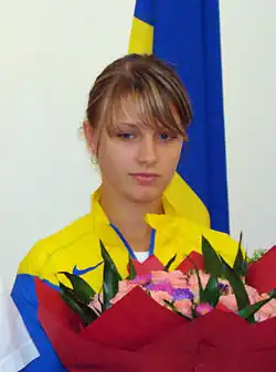 Kharlan joined the Ukrainian national team at the age of 14, in 2005.[19][20] Her first medal in an international competition was a bronze medal in the 2005 Junior World Championships in Linz, Austria.[21] She also took a silver medal in the team event. That same year, she reached the quarter-finals in the 2005 European Fencing Championships in Zalaegerszeg, Hungary, despite still being a cadet. She won four consecutive junior world titles from 2007-10.[22] She placed second in the 2006 European Seniors Fencing Championship in İzmir, Turkey, after a close 14–15 defeat against Russia's Sofiya Velikaya. In 2006–07, she ranked 2nd in the world in women's junior sabre.[1]