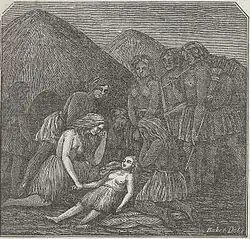 Olive Oatman's 1860s lecture notes tell of her younger sister often yearning to join that better "world" where their "Father and Mother" had gone.[16] Mary Ann died of starvation while the girls were living with the Mohave. This happened in about 1855–56, when Mary Ann was ten or eleven. It has been claimed that there was a drought in the region,[3]: 105 and that the tribe experienced a dire shortage of food supplies, and Olive herself would have died had not Aespaneo, the matriarch of the tribe, saved her life by making a gruel to sustain her.[5]: 98