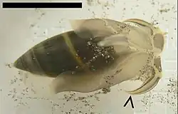 Olivella semistriata, scale bar: 1 cm. Arrowhead highlights lateral propodial appendage. From [1]