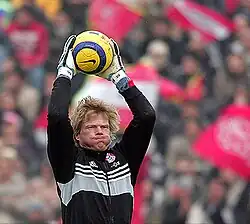 Oliver Rolf Kahn (German: [ˈɔlivɐ ˈkaːn]; born 15 June 1969)[3] is a German football executive and former professional player who played as a goalkeeper. He started his career in the Karlsruher SC Junior team in 1975. Twelve years later, Kahn made his debut match in the professional squad. In 1994, he was transferred to Bayern Munich for the fee of DM 4.6 million, where he played until the end of his career in 2008. His commanding presence in goal[4] and aggressive style earned him nicknames such as Der Titan ([deːɐ̯ tiˈtaːn], "The Titan") from the press and Vul-kahn ("volcano") from fans.[5]