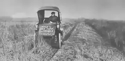 The Nebraska roads and those in western Iowa were especially brutal. Government road programs had not been implemented yet, so both the roadways and any signage were privately maintained, if maintained at all. It would be another two years before local automobile enthusiasts would adopt the western Iowa segment as the White Pole Road.[17] At the time of Fritchle's trip, the route was poorly marked and the deep mud of the "blue clay" roadways difficult to pass. The county and railroad route maps brought for navigation were inadequate. He became lost on several occasions and at times had to resort to following a compass heading or listening for passing trains in order to reconnect with the proper route. The wrong turns, low speeds required for the road conditions, and the need to stop early due to driver exhaustion put him behind schedule. Differences between odometer readings entered in his log and mapped route distances indicated well over 100 miles (160 km) of wrong turns between Lincoln and Cedar Rapids, Iowa; most of which likely occurred west of Des Moines.