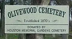 In 1875, the land, which had previously been used for slave burials, was purchased by Richard Brock, Houston's first black alderman. It opened as a cemetery for black Methodists in 1877.[1] When Olivewood was platted, it was the first African-Americans burial ground within the Houston city limits.[2]