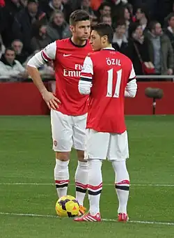 On 30 September 2014, his 28th birthday, Giroud signed a new contract at Arsenal, keeping him at the club until 2018 and increasing his weekly wage to £80,000.[123] Giroud returned to action quicker than expected, replacing Aaron Ramsey for the last 13 minutes of a 1–2 home defeat against Manchester United on 22 November and scoring Arsenal's consolation goal in added time.[124] Later, he scored twice in a 4–1 home victory against Newcastle United on 13 December.[125] Thirteen days later, he was sent off in Arsenal's 2–1 win over Queens Park Rangers for a headbutt on Nedum Onuoha after being pushed by the QPR defender.[126] He later returned from his three-game suspension to feature in a 3–0 victory at home against Stoke City on 11 January.[127] On 18 January, he scored the second goal in a 2–0 victory against Manchester City, giving the gunners their first victory at the City of Manchester Stadium since 2010.[128] Giroud carried on his Premier League form by opening the scoring and by setting up Mesut Özil for the second goal of the match as Arsenal beat Aston Villa 5–0.[129]