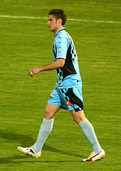 Giroud spent five years developing in Grenoble's youth academy before signing his first professional contract at the age of 21. He later admitted that signing his first contract was an important part in his development as a player, stating "It took me signing my first professional contract to become aware of my abilities. If you [a club] trusted me, it was because I must have had some qualities."[10] Ahead of the 2005–06 season, he was promoted to the club's reserve team, which was playing in the Championnat de France Amateur 2, the fifth level of French football. Giroud quickly became an important player in the team scoring 15 goals in 15 matches.[10] His performances over seven months with the reserve team resulted in the player being called up to the senior team in March 2006 by manager Thierry Goudet. Giroud made his professional debut on 27 March appearing as a late-match substitute in a 1–1 draw with Gueugnon in Ligue 2.[11] He remained a part of the senior team for the rest of the campaign making five more substitute appearances.