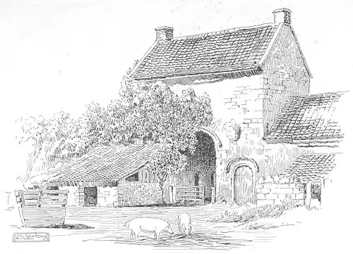 The remains of the mediaeval fortified manor of Olveston Court stand on the western outskirts of the village. It was for a while the seat of the Denys family of nearby Siston who had inherited Olveston manor, together with nearby Alveston, Earthcott Green, Siston and a moiety (1/2) of Aust together with the rights of the Hundred Court of Langley, in 1380 on marriage to Margaret Corbet, granddaughter of Sir Peter Corbet(d.1362) Lord of Caus, Shropshire. In addition to these Gloucestershire lands, the manors of Lawrenny in Pembrokeshire and Hope-juxta-Caus in Shropshire were also inherited.[3] Due to the possibility for confusion between Alveston and Olveston, the Inquisition post mortem of Sir Gilbert Denys, taken at Chipping Sodbury on 25 June 1422, is given here: