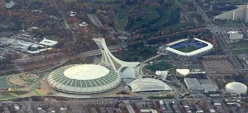 The Montreal Olympic Park (French: Parc olympique de Montréal) is a sports and entertainment precinct located in the Hochelaga-Maisonneuve neighbourhood of Montreal, Quebec. It is separated from Maisonneuve Park and the Montreal Botanical Garden by Sherbrooke Street on its northern end (in Montreal's cardinal regime), and bordered by Viau Street to its east, Pierre de Coubertin Avenue to its south, and Pie-IX Boulevard to its west.